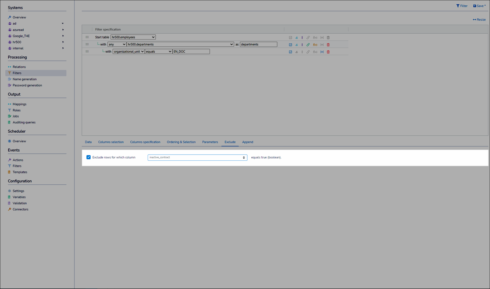 Some filters return unwanted duplicate rows. For example, suppose you want a de-duplicated list of all employees who have a contract in the HR500 test dataset. The filter below attempts to achieve this, but returns duplicate rows since some employees have multiple contracts: