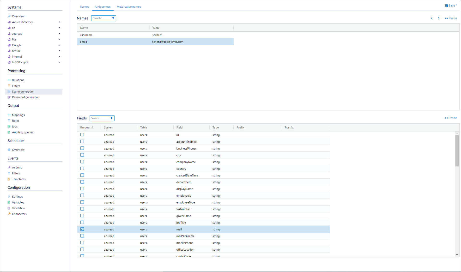 In the Fields pane, select the checkbox for each column against which the selected name should be checked for uniqueness.