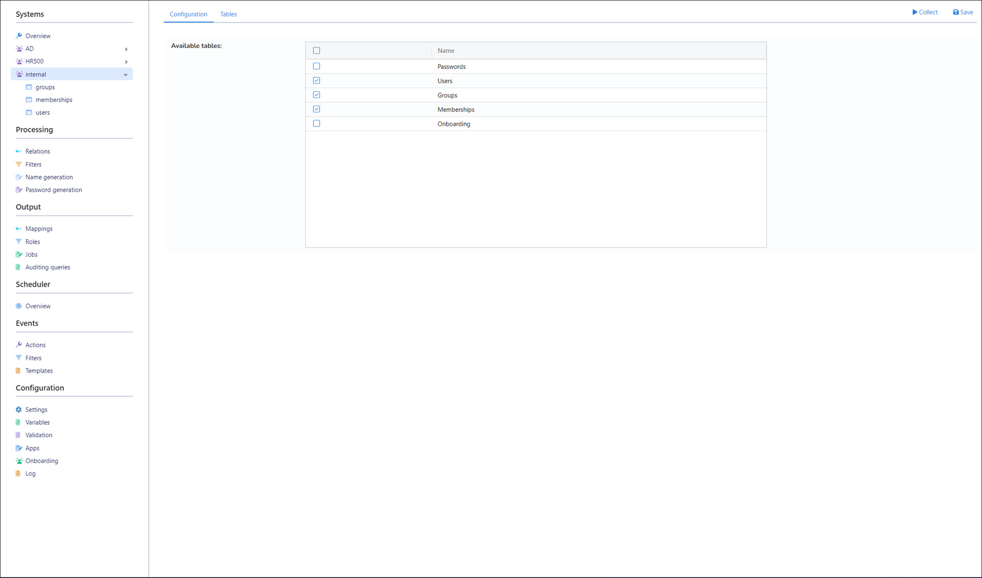 The internal system is a special target system that contains the users, groups, and memberships of NIM itself. These are primarily used to control access to Apps.