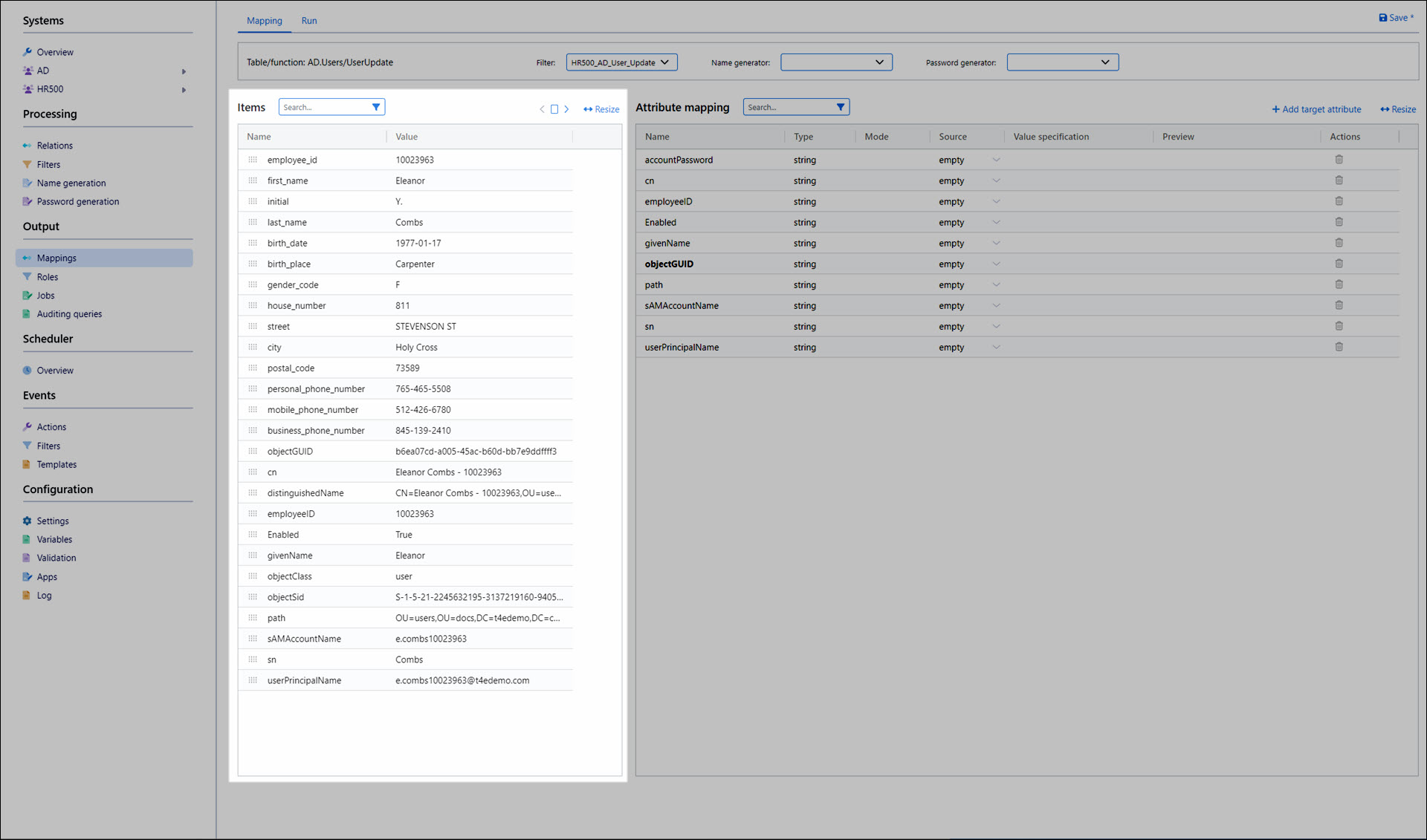 For the mapping's Filter, select HR500_AD_User_Update. Its columns are populated into the Items pane.