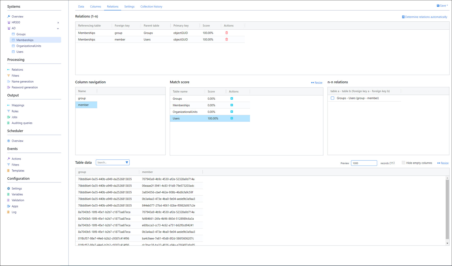 There is only one table in our AD target system that needs intra-system relations — the Memberships table, which stands in between users and groups.